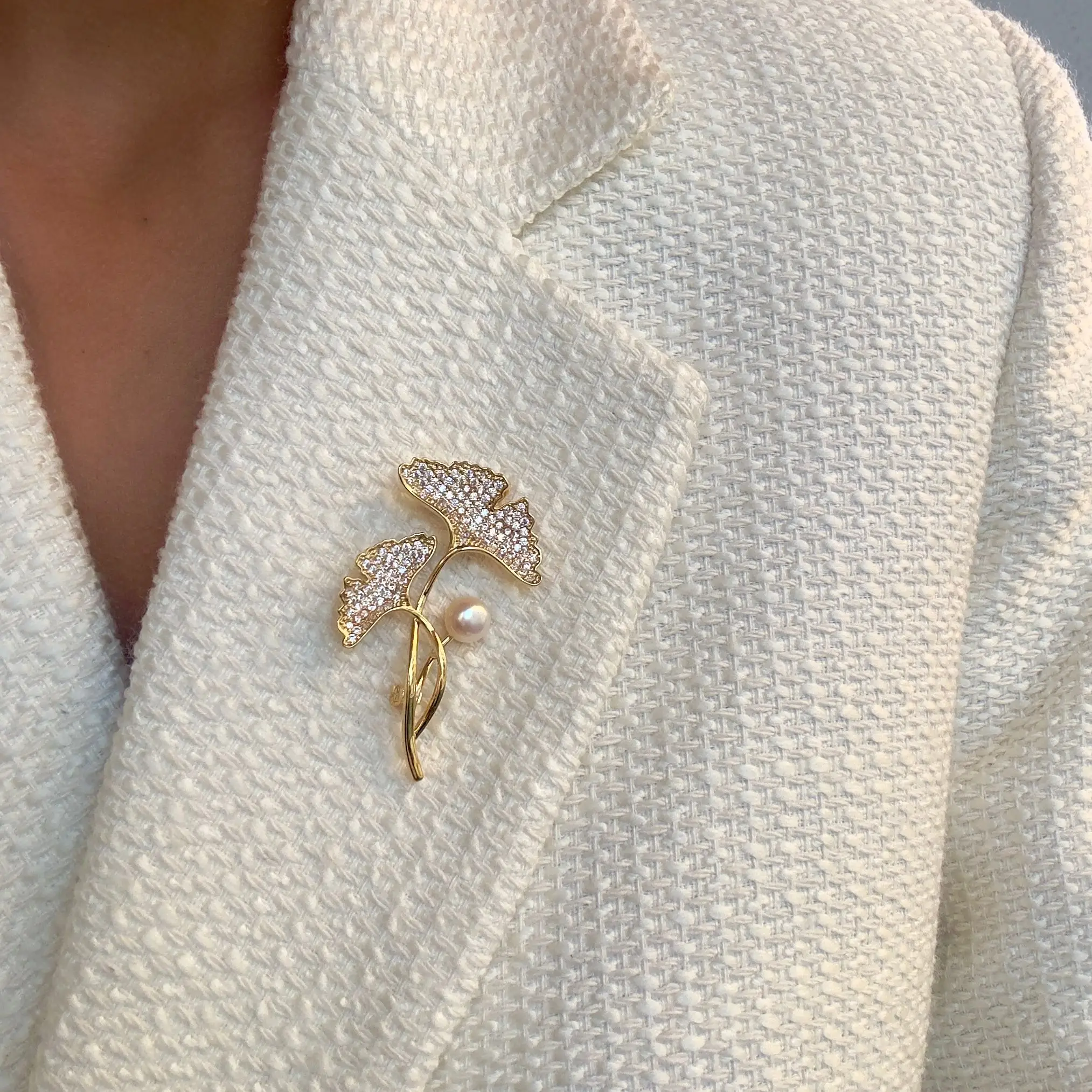 GY0014 Gold Taş ve İnci Detaylı Çiçek Broş