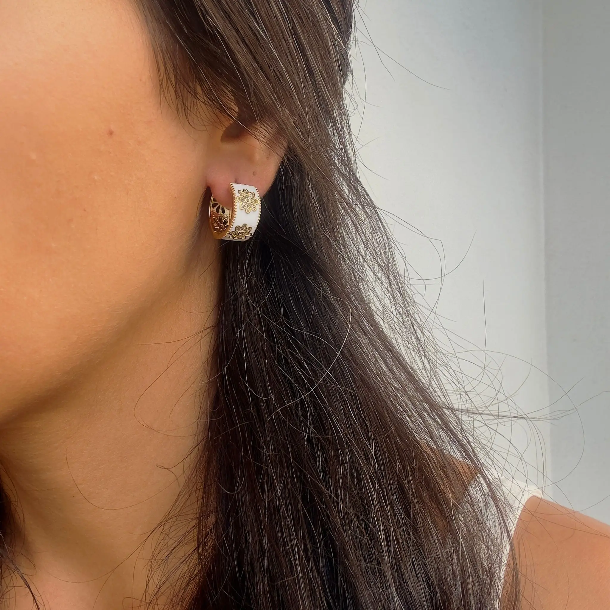 GY0051 Gold Beyaz Çiçekli Halka Küpe