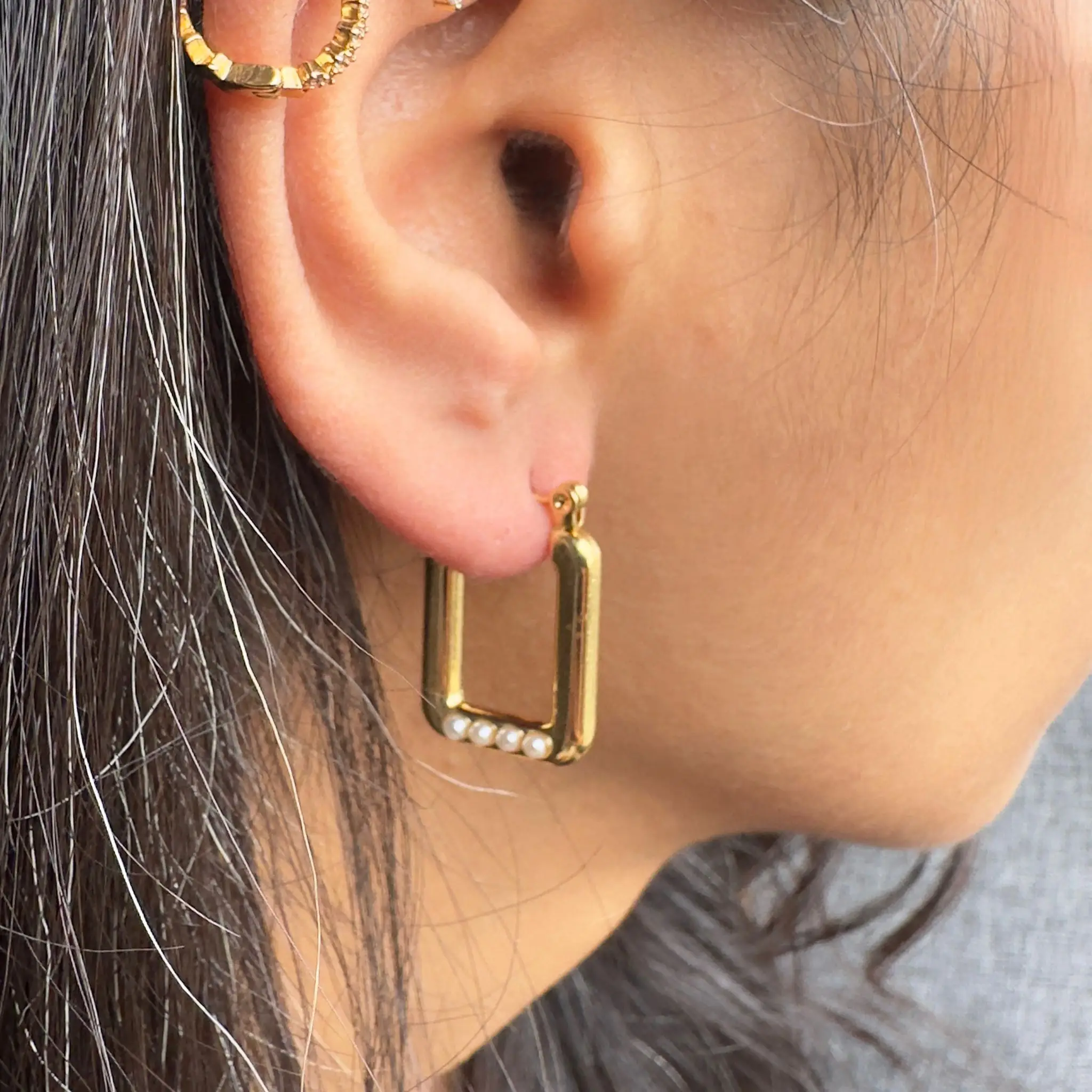 İnci Detaylı Dikdörtgen Gold Küpe